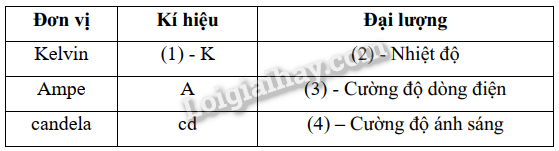 D. (1) K; (2) Khối lượng; (3) Cường độ dòng điện; (4) Cường độ ánh sáng.