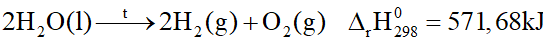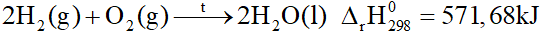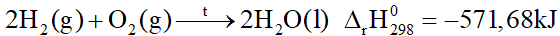 Phản ứng giữa 2 mol khí hydrogen và 1 mol khí oxygen tạo thành 2 mol H2O lỏng, giải phóng nhiệt lượng 571,68 kJ. Phương trình nhiệt hóa học được biểu diễn là