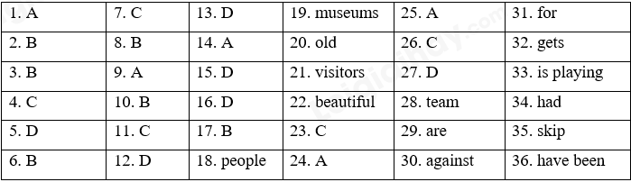 This is London. Every year more than nine million (18) _________ come from countries all over the world to visit London. They go to theaters and (19) _________. They look at interesting old buildings. Many of them are hundreds of years (20) _________. They sit or walk in the beautiful parks, or have a drink in a pub. They go to Oxford Street to look at the shops. They sit or, or to Harrods. Two million (21) _________ go to the Tower of London. A million more go to see St Paul’s Cathedral. Yes, London is a big and (22) _________ city with lots to see and do.