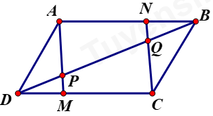 Xét tam giác \(\Delta DMP\) và \(\Delta BNQ\) ta có \(DM = NB\) (giả thiết), \(\widehat {PDM} = \widehat {QBN}\) (so le trong)