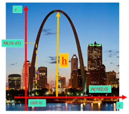 Câu 2: Khi du lịch đến thành phố Xanh Lu-I (Mĩ), ta sẽ thấy một cái cổng lớn có hình parabol hướng bề lõm xuống dưới, đó là cổng Ac-xơ. Khoảng cách giữa hai chân cổng là 162m. Từ một điểm trên thân cổng người ta đo được khoảng cách tới mặt đất là \(43{\mkern 1mu} m\) và khoảng cách tới điểm chân cổng gần nhất là \(10{\mkern 1mu} m\). Chiều cao của cổng gần với số nào sau đây?