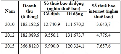 => Biểu đồ thích hợp nhất thể hiện tình hình hoạt động bưu chính viễn thông ở nước ta giai đoạn 2010 – 2015 là: biểu đồ kết hợp cột và đường.