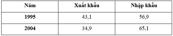 => Sử dụng kĩ năng nhận dạng biểu đồ: biểu đồ thích hợp nhất để thể hiện quy mô và cơ cấu xuất nhập khẩu của Hoa Kì trong năm 1995 và 2004 là: biểu đồ tròn.