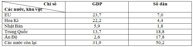 (hai hình tròn: một hình tròn thể hiện tỉ trọng GDP và một hình tròn thể hiện tỉ trọng dân số của EU cùng với các khu vực còn lại)