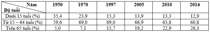 Nhận xét: Nhìn chung, giai đoạn 1950 – 2014 cơ cấu dân số theo nhóm tuổi ở Nhật Bản có sự thay đổi theo thời gian