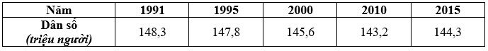 + Giai đoạn 1991 – 2015: dân số giảm liên tục, từ 148,3 triệu người xuống 143,2 triệu người (giảm 5,1 triệu người) => Nhận xét D đúng