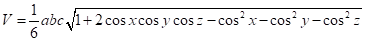 \(\widehat {ASB} = x,\widehat {BSC} = y,\widehat {ASC} = z,\) \(SA = a,SB = b,SC = c\) thì có thể tích: