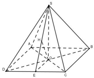 Lấy \(E\) là trung điểm \(DC\) ta có \(OE \bot DC;OE = \frac{1}{2}DC = \frac{a}{2}\) (do \(\Delta ODC\) vuông cân tại \(O\))