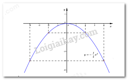 Vậy đồ thị hàm số \(\left( P \right):\,\,y =  – \dfrac{1}{4}{x^2}\) là đường cong đi qua các điểm \(\left( { – 4;\, – 4} \right),\,\,\left( { – 2;\, – 1} \right),\,\,\left( {0;\,\,0} \right),\,\left( {2;\,\, – 1} \right),\,\,\left( {4; – 4} \right).\)