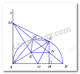 Cho nửa đường tròn \(\left( O \right)\) đường kính \(AB\). Vẽ tia tiếp tuyến \(Ax\) cùng phía với nửa đường tròn đường kính \(AB\). Lấy một điểm \(M\) trên tia \(Ax\,\,\left( {M \ne A} \right)\). Vẽ tiếp tuyến \(MC\) với nửa đường tròn \(\left( O \right)\) (\(C\) là tiếp điểm). Vẽ \(AC\) cắt \(OM\) tại \(E\), vẽ \(MB\) cắt nửa đường tròn tại \(D\,\,\left( {D \ne B} \right)\).