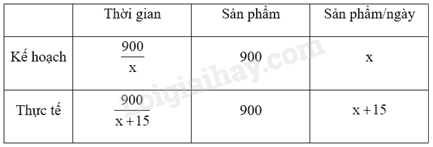 Thời gian để phân xưởng đó làm xong 900 sản phẩm theo kế hoạch là: \(\frac{{900}}{x}\) (ngày)