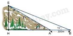 Câu 20: Để xác định chiều dài của cáp treo trượt tuyết cần lắp đặt từ điểm \(A\) đến điểm \(S\), một nhân viên trắc địa đo được \(\angle SAH = 25^\circ \), sau đó anh ta đi xa ra một đoạn \(300\;m\) tới điểm \(B\) và đo được \(\angle SBH = 15^\circ \) (tham khảo hình vẽ). Tính chiều cao SH của núi (kết quả làm tròn là 2 chữ số thập phân).