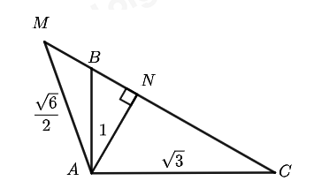 b) Trên tia đối của tia BC lấy điểm M sao cho \(AM = \frac{{\sqrt 6 }}{2}\). Tính số đo góc \(\angle AMC\).