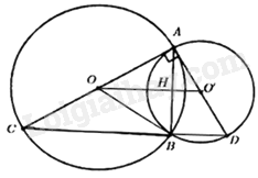 Câu 12: Cho hai đường tròn \(\left( {O;4} \right)\) và \(\left( {O’;3} \right)\) cắt nhau tại hai điểm \(A,B\). Gọi \(AC,AD\) lần lượt là các đường kính của \(\left( O \right)\) và \(\left( {O’} \right)\) sao cho \(AC,AD\) vuông góc với nhau như hình vẽ.