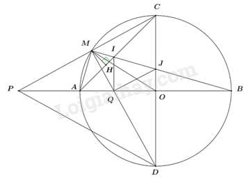 Câu 15: Cho \(\left( {O;R} \right)\) có hai đường kính \(AB\) và \(CD\) vuông góc với nhau. Lấy điểm \(M\) trên cung nhỏ \(AC\)(\(M\) khác \(A\) và \(C\)). Gọi \(P,Q\) lần lượt là giao điểm của \(AB\) với \(MC\) và \(MD\).