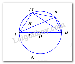 Cho đường tròn \(\left( {O;R} \right)\) đường kính \(AB\), dây cung \(MN\) vuông góc với \(AB\) tại \(I\) sao cho \(AI < BI\). Trên đoạn thẳng \(MI\) lấy điểm \(H\) (\(H\) khác \(M\) và \(I\)), tia \(AH\) cắt đường tròn \(\left( {O;R} \right)\) tại điểm thứ hai là \(K\). Chứng minh rằng: