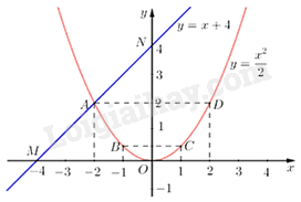 Ta vẽ được đồ thị hàm số \(y = \frac{{{x^2}}}{2}\) và \(\left( d \right):y = x + 4\) trên cùng hệ trục toạ độ như sau: