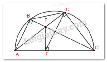 Trên nửa đường tròn đường kính \(AD\) lấy hai điểm \(B,C\) phân biệt sao cho \(B\) ở giữa \(A\) và \(C\) (\(B\) khác \(A\) và \(C\) khác \(D\)). Gọi \(E\) là giao điểm của \(AC\) và \(BD\), \(F\) là chân đường vuông góc kẻ từ \(E\) xuống \(AD\). Chứng minh rằng: