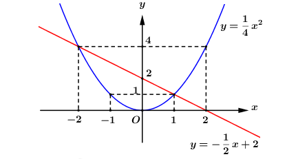 \( \Rightarrow \) Parabol \(\left( P \right):\,\,y = \dfrac{1}{4}{x^2}\) đi qua các điểm \(\left( { – 4;4} \right),\,\,\left( { – 2;1} \right)\), \(\left( {0;0} \right),\,\,\left( {2;1} \right),\,\,\left( {4;4} \right)\).