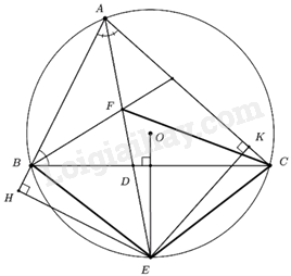 Câu 9: Cho đường tròn \(\left( O \right)\) và \(BC\) là một dây cung khác đường kính của \(\left( O \right),A\) là điểm di động trên cung lớn \(BC\) sao cho \(AC > AB\left( {A \ne B} \right)\). Gọi \(D\) là chân đường phân giác trong góc \(\widehat {BAC}\) \(\left( {D \in BC} \right)\). Đường thẳng đi qua \(O\) và vuông góc với \(BC\) cắt đường thẳng \(AD\) tại \(E\). Kẻ \(EH,EK\) lần lượt vuông góc với \(AB\) và \(AC\left( {H \in AB,K \in AC} \right)\).