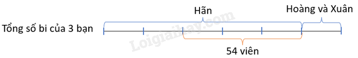 Vậy sau khi Hoàng và Xuân cho đi 54 viên bi, số bi của Hãn chiếm 5 phần tổng số bi , tổng số bi của Hoàng và Xuân chiếm 1 phần. Mà số bi của Hãn ban đầu là 2 phần nên số bi biểu thị 54 viên bi là 3 phần.