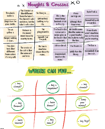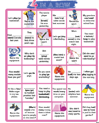 Play the games in pairs or small group. In turns, choose any square and answer the question. If you get it right, the square is yours. The one who succeeds in playing four of their square in a horizental, vertical or diagoanal row, wins the game.!