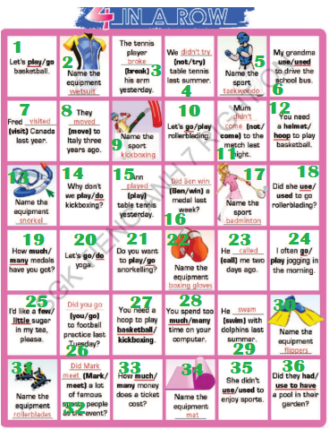 (Chơi các trò chơi theo cặp hoặc nhóm nhỏ. Lần lượt chọn ô vuông bất kỳ và trả lời câu hỏi. Nếu bạn làm đúng, hình vuông là của bạn. Người thành công khi chơi bốn ô vuông của họ theo hàng ngang, hàng dọc hoặc hàng chéo, sẽ thắng trò chơi.!)