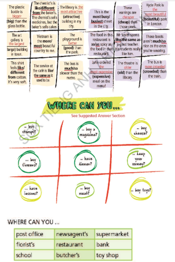 (Chơi trò chơi theo cặp hoặc nhóm nhỏ. Lần lượt chọn ô vuông bất kỳ và trả lời câu hỏi. Nếu bạn làm đúng, hình vuông là của bạn. Người thành công trong việc đặt ba hình vuông của họ thành một hàng ngang, dọc hoặc chéo, sẽ thắng trò chơi!)