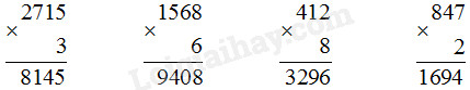 \(\begin{array}{l}2715 \times 3\\1568 \times 6\\412 \times 8\\847 \times 2\end{array}\)
