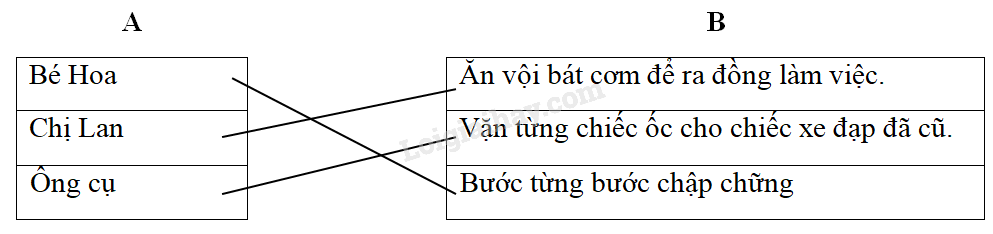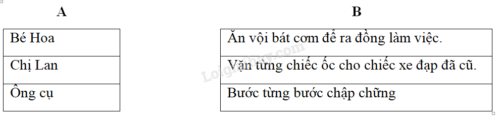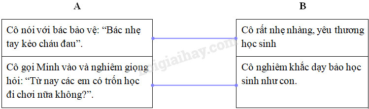 b. Nối mỗi hành động và lời nói ở cột A với tình cảm, trách nhiệm của cô giáo đối với học sinh ở cột B cho phù hợp: