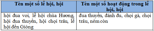 hội đua voi, đua thuyền, đánh đu, chọi gà, lễ hội chùa Hương, hội đua thuyền, hội chọi trâu, lễ hội đền Gióng, chọi trâu, ném còn