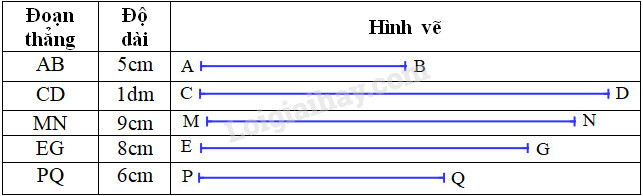 Vẽ và viết tên đoạn thẳng vào bảng (theo mẫu):