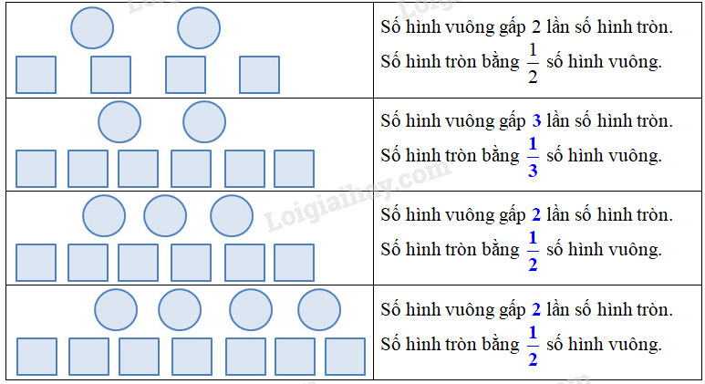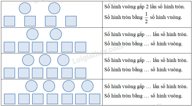 – Lấy số hình vuông chia cho số hình tròn rồi điền số thích hợp vào chỗ trống.