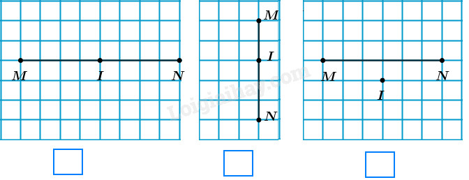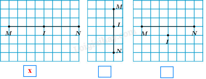 Trong các hình vẽ dưới đây, hình nào có điểm I là trung điểm của đoạn thẳng MN ? Đánh dấu (×) vào ô trống dưới hình đó.