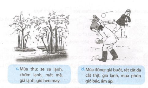 d) Mùa đông : giá buốt, rét cắt da cắt thịt, giá lạnh, mưa phùn gió bấc, ấm áp.