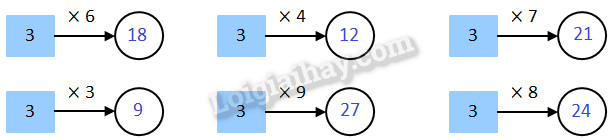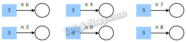 Thực hiện phép nhân 3 với các số đã cho rồi điền kết quả vào hình tròn còn trống.