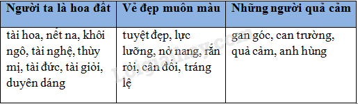 Xếp các từ đã cho thành ba nhóm tương ứng với ba chủ điểm đã học rồi ghi vào bảng dưới đây: