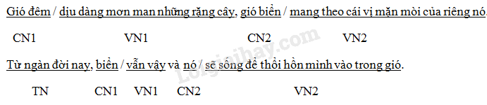 Theo như phần xác định ở câu a ta xác định được hai vế câu trong câu vừa rồi là “gió đêm dịu dàng mơn man những rặng cây” “gió biển mang theo cái vị mặn mòi riêng của nó”