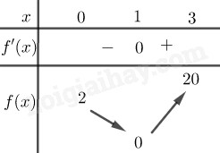 Bước 1: Giải phương trình \(y’ = 0\) tìm nghiệm \(x \in \left[ {0;3} \right]\). Tính giá trị của hàm số tại các nghiệm vừa tìm được và f(0), f(3).