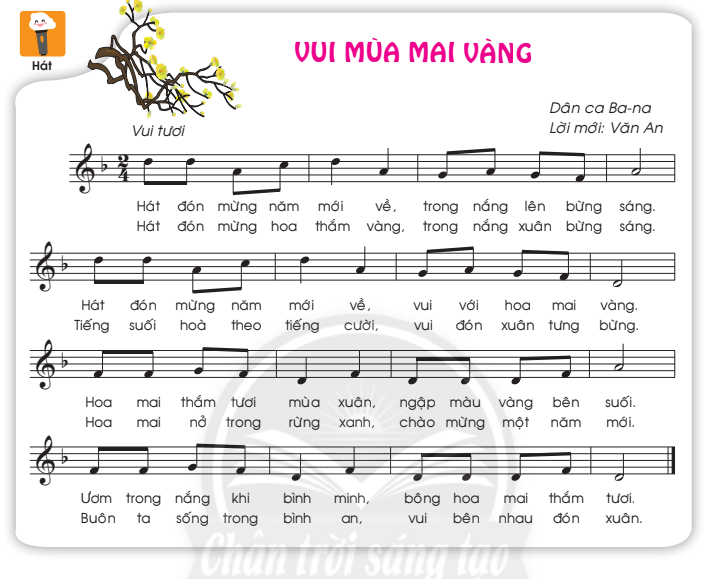 * Câu hát: Hoa mai vàng thắm tươi mùa xuân, ngập màu vàng bên suối; Tiếng suối hòa theo tiếng cười. ” diễn tả cảnh đẹp thiên nhiên vào mùa xuân.