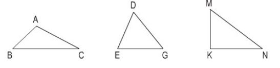 Viết tên ba góc và ba cạnh của mỗi hình tam giác dưới đây:
