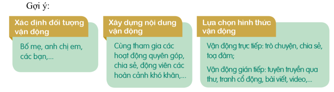 + Đối tượng vận động: bố mẹ, anh chị em, các bạn, thầy cô trong trường, hàng xóm…