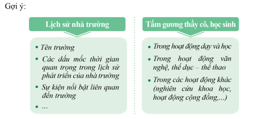 * Chia sẻ cảm xúc về việc tìm hiểu truyền thống nhà trường và các sản phẩm của em và các bạn.