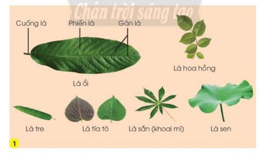 – Nêu tên và so sánh hình dạng, màu sắc, kích thước của các lá cây trong các hình: