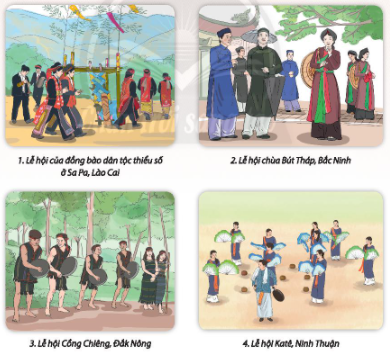 Quan sát hình, hãy: Chọn và mô tả kiểu dáng, màu sắc trang phục của một nhân vật. Chỉ ra điểm khác nhau giữa trang phục mà em chọn và trang phục lễ hội khác