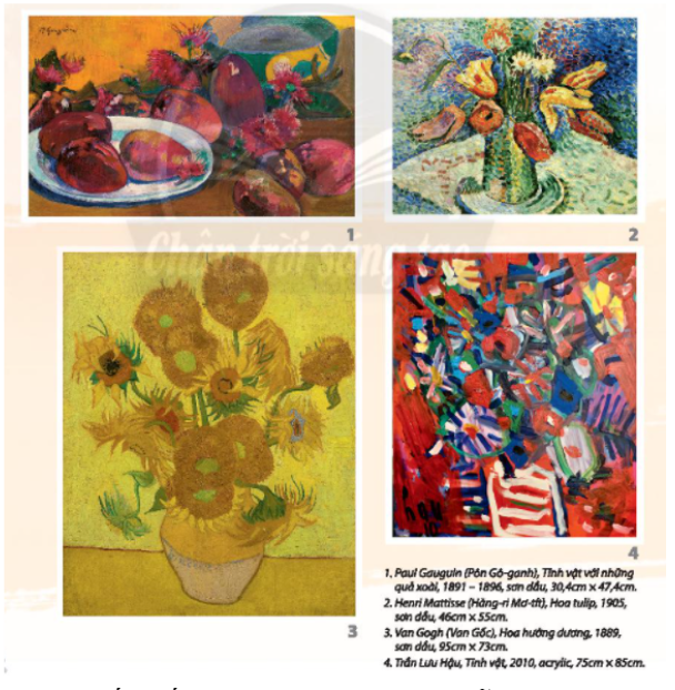 Quan sát tranh và cho biết: Cách sắp xếp hình, màu của vật mẫu trong tranh như thế nào? Hòa sắc và cách diễn tả trong mỗi bức tranh có điểm gì ấn tượng?
