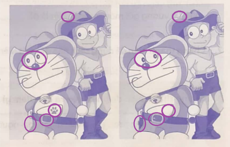 Em hãy tìm điểm khác nhau giữa hai bức tranh về Nô-bi-ta và Đô-rê-mon: