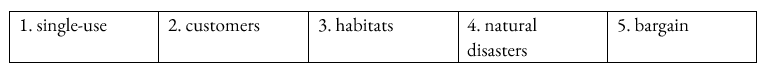 customers          bargain          single-use          habitats          natural disasters
