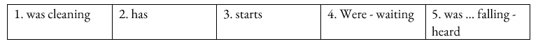 Giải thích: Hành động thiếp đi đang xảy ra thì hành động gõ cửa chen ngang vào. Do đó ở đây ta sẽ dùng thì quá khứ tiếp diễn cho chỗ trống đằng trước và thì quá khứ đơn cho chỗ trống đằng sau. → was … falling – heard.