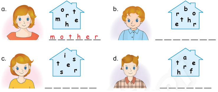 1. Listen and repeat. 2. Listen and read. 3. Act out. Introduce your family. 4. Write the words. 5. Read and match. 6. Draw. Introduce a family member.